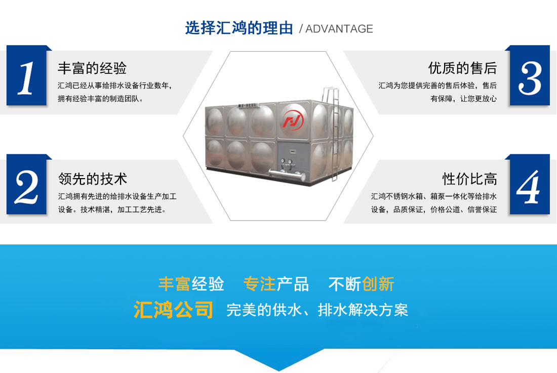 鹽城匯鴻供水設備有限公司是一家專業從事供排水設備系統生產、銷售與工程安裝于一體的專業企業。本公司主要生產、銷售、安裝各類不銹鋼水箱、箱泵一體化、不銹鋼保溫水箱、組合式水箱、聚氨酯保溫模塊、圓柱形水箱、消防水箱、玻璃鋼水箱、玻璃鋼化糞池等十多個系列數百種規格,產品廣泛應用于建筑、環保、化工、食品、消防等各個領域。具有優質高效、節能環保、安全可靠、實用方便等優點,是二十一世紀商用和家用生活的首選產品。本公司生產設備先進,技術精湛,各種產品的加工工藝,技術性能和衛生指標均符合國家標準,并可根據用戶提供的技術參數和要求設計制造現場加工……【更多詳情】 | |